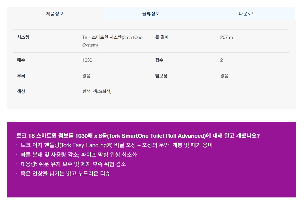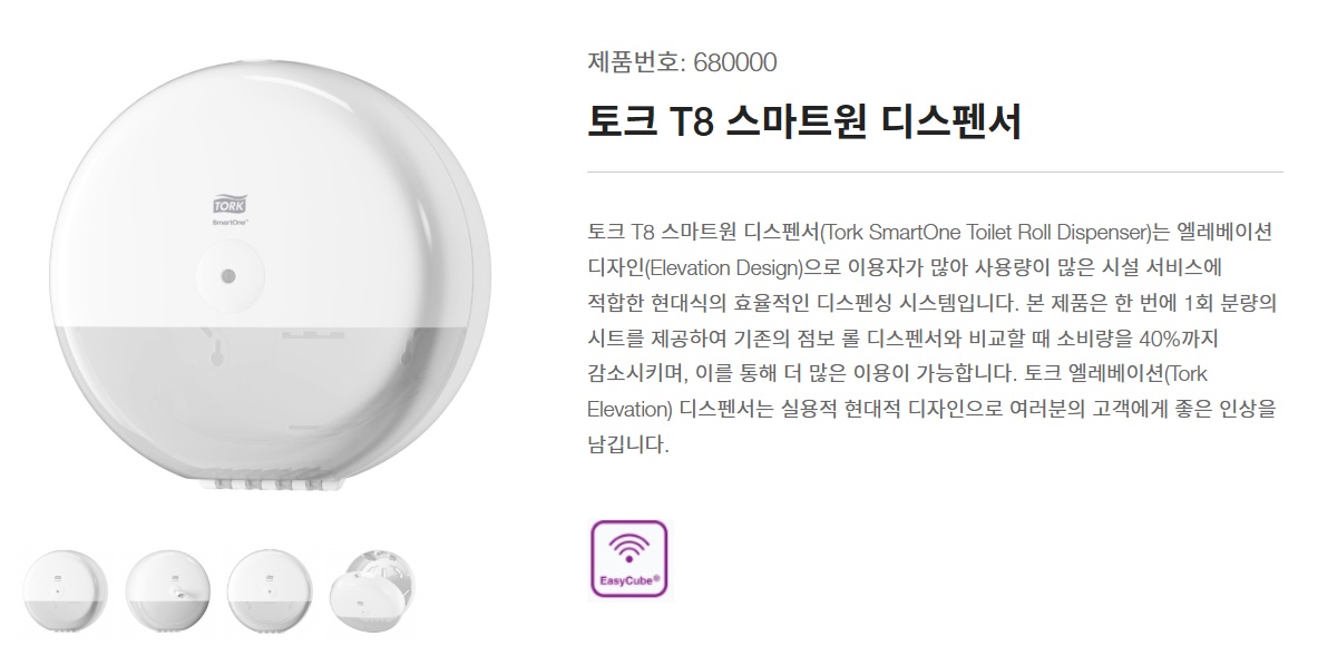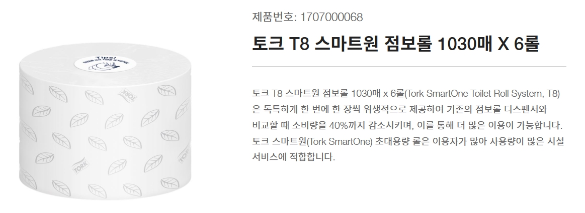 【T8 스마트원 화장지】 토크T8/점보롤/스마트원 리필/천연펄프/1,030매 Ⅹ 6롤/박스/디스펜서 별도구매/무료배송