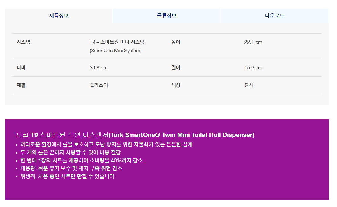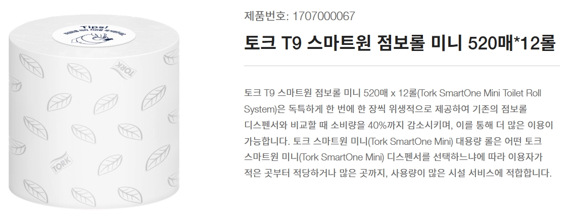 【T9 스마트원 점보롤 화장지】 토크T9/점보롤/스마트원 미니 리필/520매 x 12롤/박스/스마트트윈디스펜스별도/무료배송